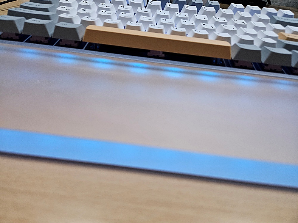 그리고 바로 이것. 아크릴 제품으로 구입한 이유가 바로 이것입니다. 키보드 주변 LED를 켜면 이렇게 아크릴 팜레스트도 예쁘게 빛이 들어옵니다. 무지색 색상이 연속적으로 변할 때는 팜레스트까지도 제법 예쁘게 보입니다.