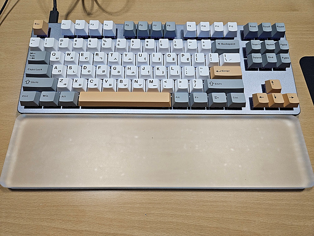 아크릴 재질로 된 기성품입니다. 이 키보드는 가로 길이로 360mm보다 조금 더 길기 때문에 표준적인 텐키리스 팜레스트인 360mm 제품이 약간 짧습니다. 하지만 사용에는 아무런 문제가 없습니다.