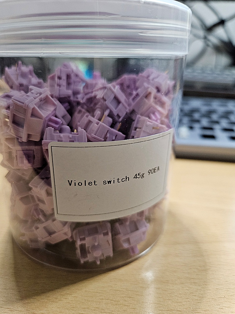 이제 스위치입니다. 요즘 인기있는 리니어 계열 중에서 바이올렛 스위치를 선택했습니다. 텐키리스니 90개 세트를 구매했습니다. 색상도 예쁘고 포장도 예쁘게 배송되는군요.