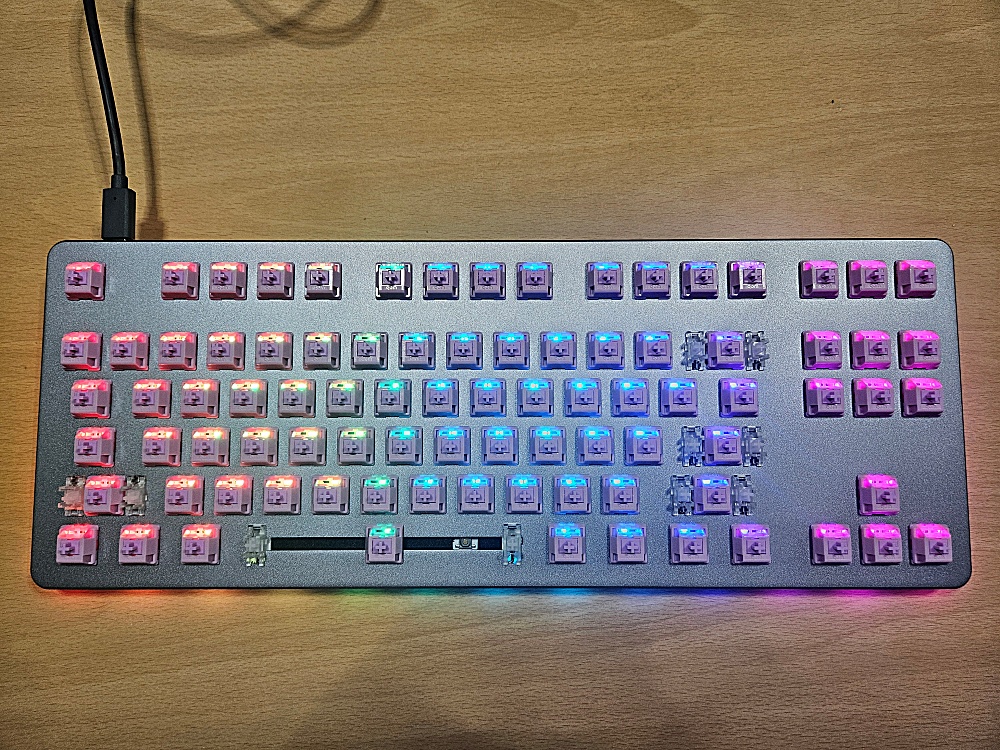 키캡을 씌우지 전에 일단 연결해서 테스트를 해봅니다. 모두 불이 잘 들어옵니다. 핀이 휘거나 잘못 끼워진 스위치는 없습니다.