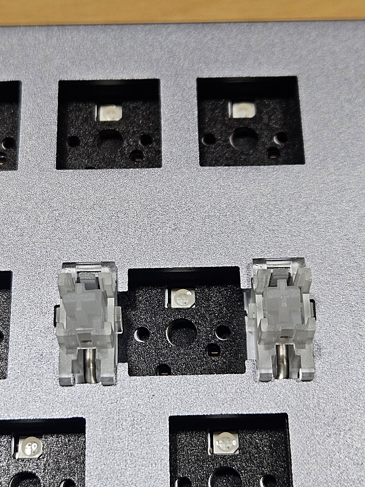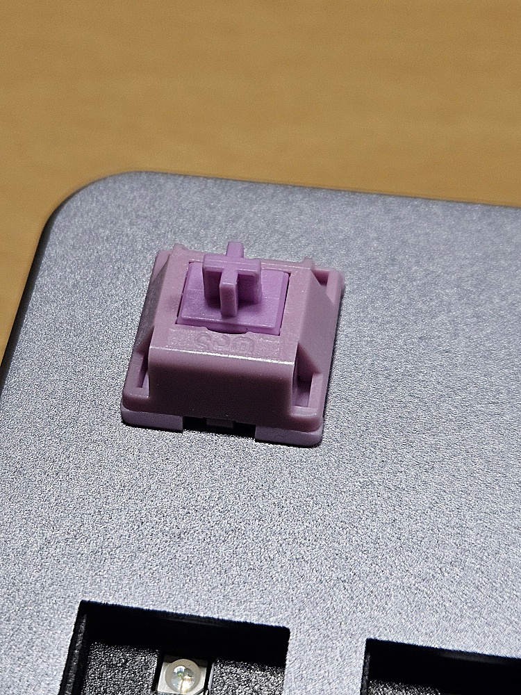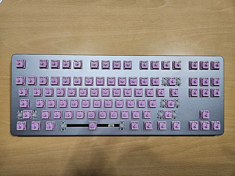 전부 꽂았습니다. 은색 위에 보라색이 잘 안어울리는 것처럼 보입니다만, 어차피 여기에 키캡을 씌울 것이기 때문에 문제 없습니다.