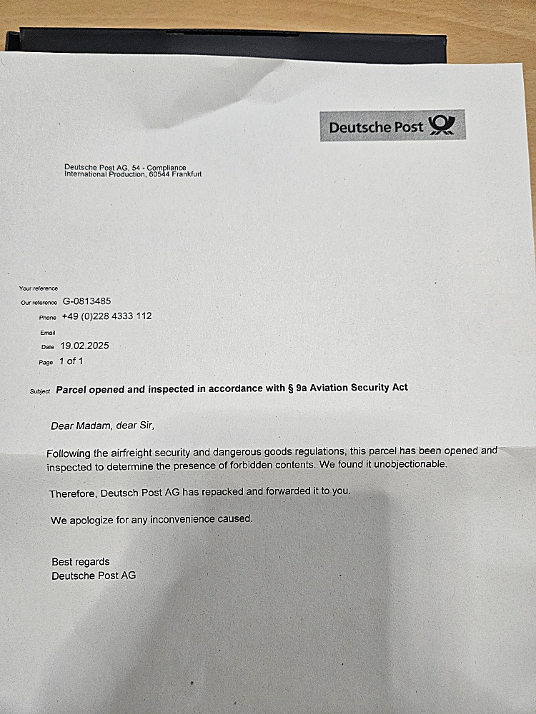 독일에서 박스를 미리 열어보았다는 메세지가 들어 있었습니다. 법조항까지 들먹이는 걸 보니 강제적인 사항인가 봅니다. 사실 그쪽에서도 귀찮은 일이긴 할 겁니다.