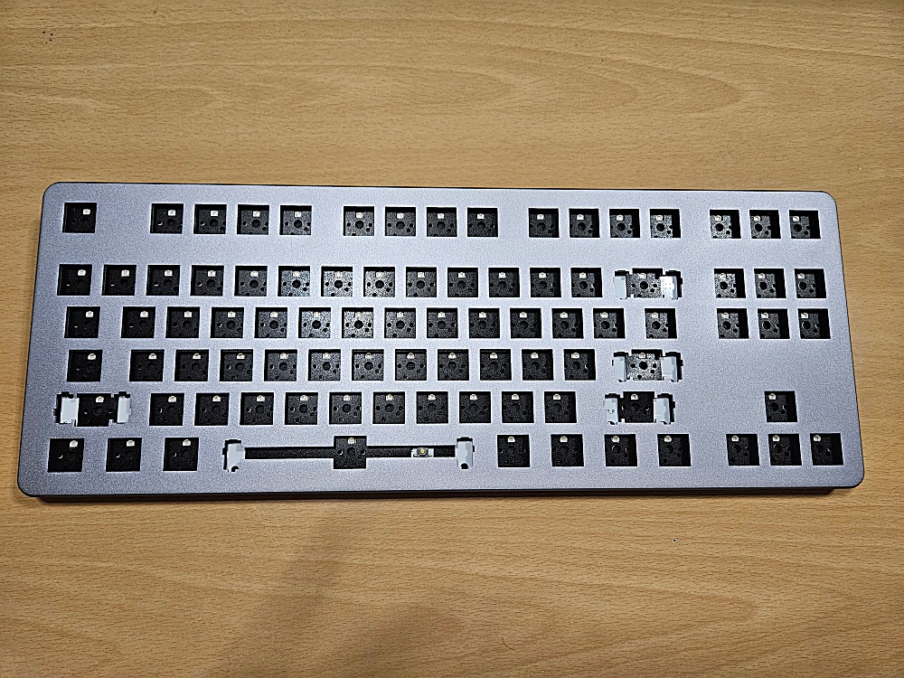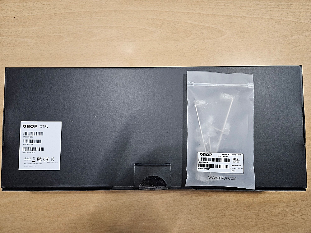 이 제품의 정식 이름은 DROP CTRL V2입니다. Drop은 여러 키보드를 만들고 이 제품의 모델이름이 CTRL입니다. 그리고 이건 CTRL의 두번째 버전의 제품입니다. 표준적인 텐키리스 배열이고, 색상은 스페이스 그레이입니다. 반조립되어 있는 상태이고 여기에 스테빌라이저, 스위치, 키캡만 끼우면 키보드가 완성됩니다.