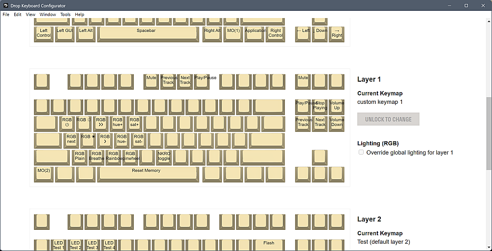 Drop의 키보드 Configurator를 설치하면 키 설정을 바꿀 수 있습니다. 저는 Fn키와 F5-F8키 조합으로 미디어 컨트롤 키를 추가로 배정했습니다. 그외에는 기본 설정을 그대로 두었습니다. 프로그램은 다운받아 설치해야 하니, 요즘 나오는 VIA에 비해 조금은 번거롭다고 할 수 있습니다.