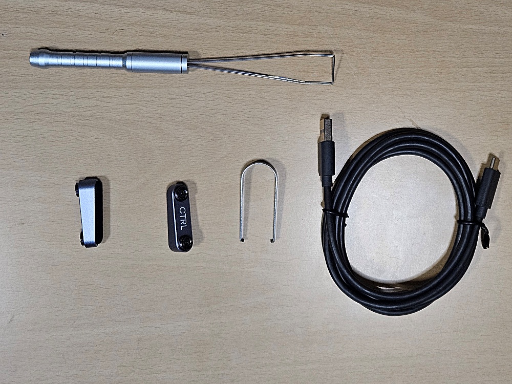 함께 동봉된 부품입니다. 키캡 리무버, 키보드 높이 조절 받침대, 스위치 리무버, 그리고 USB 케이블입니다.